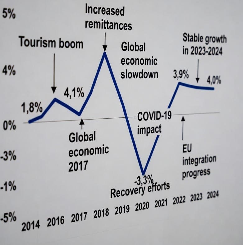 Sipas të dhënave të Bankës Botërore dhe FMN-së, GDP-ja reale ka rritur mesatarisht rreth 3.5% vjetor në periudhën 2014–2024, por kjo rritje ka qenë e pabalancuar, me varësi të lartë nga remitancat (rreth 8–10% e GDP-së) dhe turizmi (deri në 25% të GDP-së në vitet e fundit).