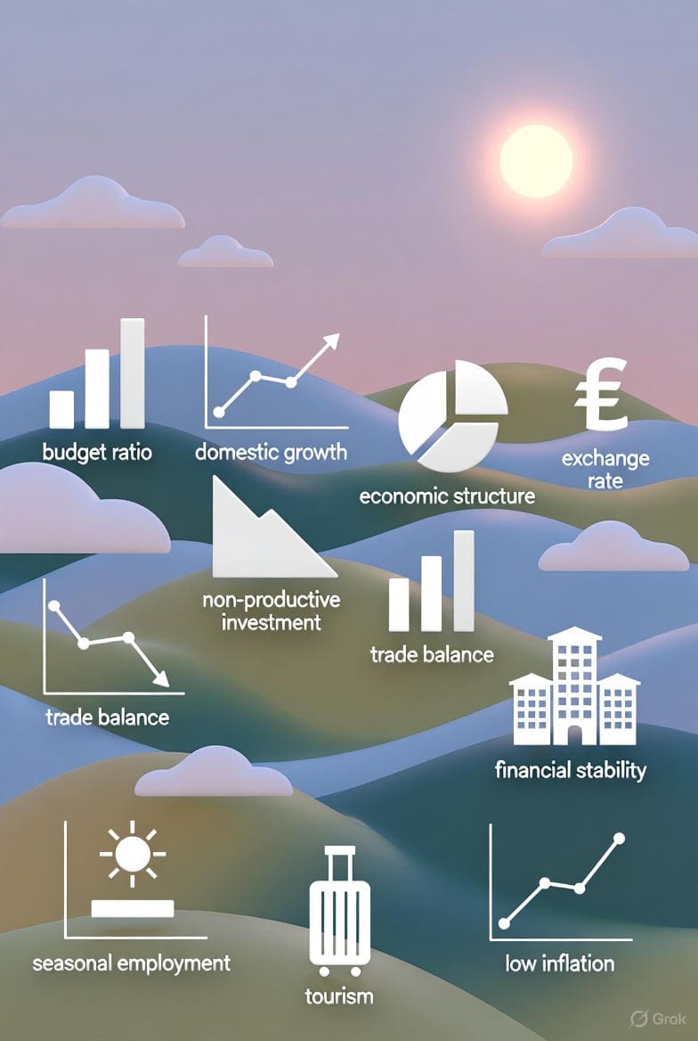 - Varësia e lartë nga sektore jo të qëndrueshëm, si turizmi, ndërtimi dhe remitancat kontribuojnë në rritje, por janë të ndikuara nga faktorë sezonalë dhe jashtë vendit, duke e bërë ekonominë vulnerabël ndaj shokëve të jashtëm.