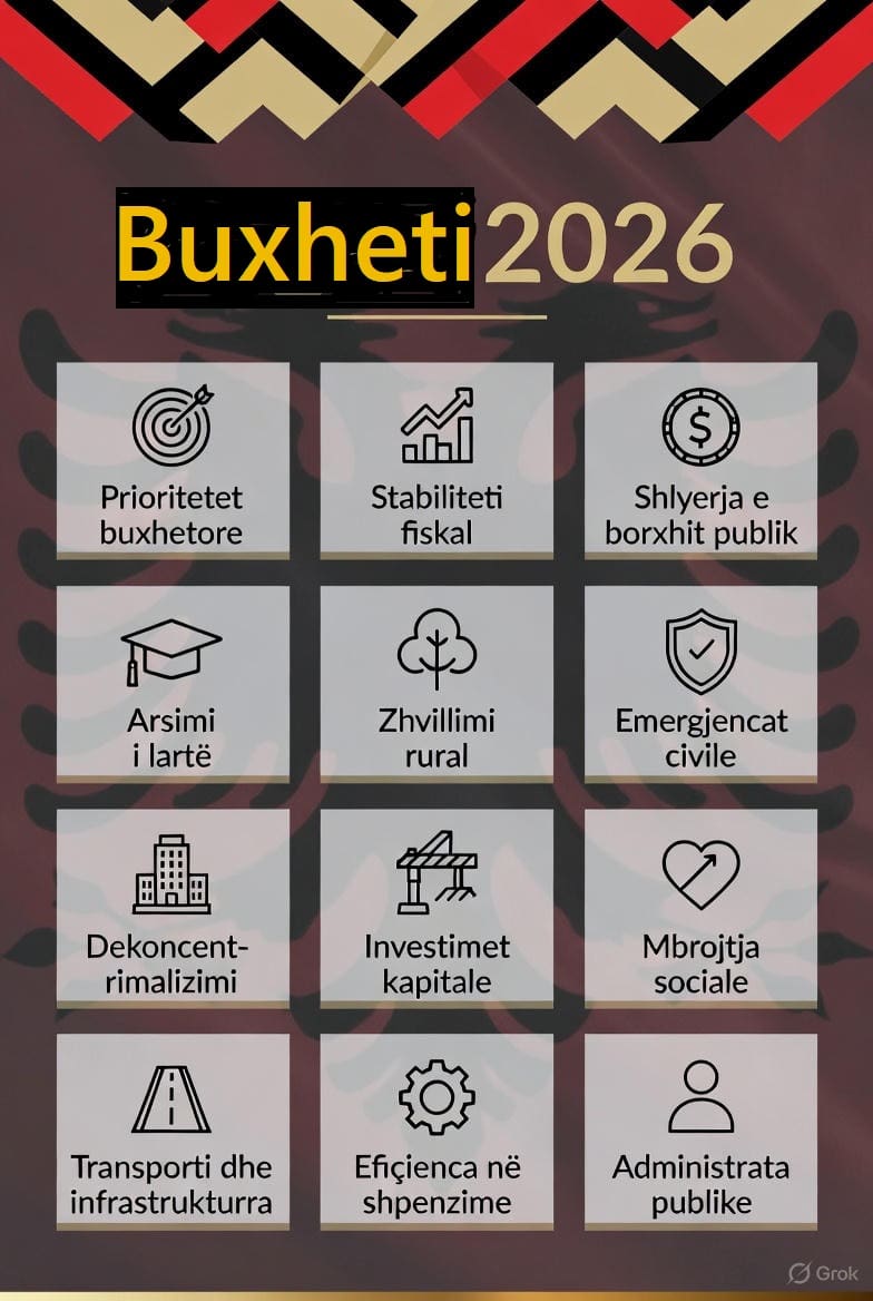 Projekt Buxheti i shtetit për vitin 2026 pasqyron një qasje të kujdesshme fiskale, e cila synon të ruajë stabilitetin e deficitit dhe borxhit publik, ndërkohë që orienton shpenzimet drejt prioriteteve sociale dhe zhvillimore.