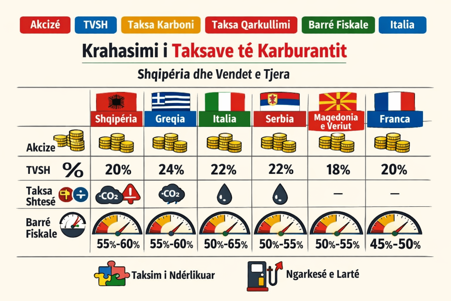 Shqipëria ka një nga strukturat më komplekse të taksimit të naftës (diesel) në rajon dhe Europë, me akcizë fikse, TVSH 20%, taksë qarkullimi, taksë karboni, Taksë qarkullimi dhe elemente të tjera si p.sh. tarifa markimi.