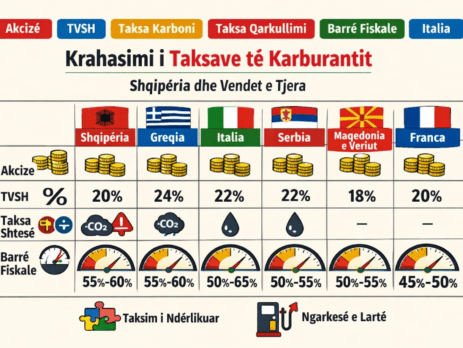 Treg i përqendruar, spekulim, informalitet dhe reagim i dobët i rezervave shtojnë presionin mbi konsumatorët Shqipëria ka një nga strukturat më komplekse të taksimit të naftës (diesel) në rajon dhe Europë, me akcizë fikse, TVSH 20%, taksë qarkullimi, taksë karboni, Taksë...
