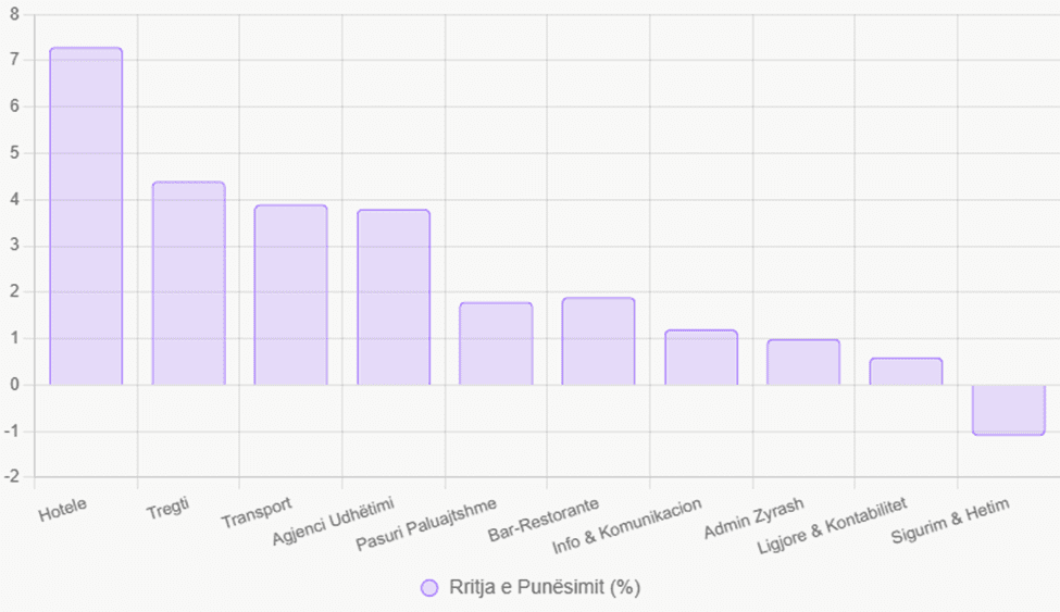 Punësimi është më i lartë në hotele (+7,3%) dhe tregti (+4,4%), ndërsa fondi i pagave +29,4% në pasuri të paluajtshme dhe +26,2% në hotele.
