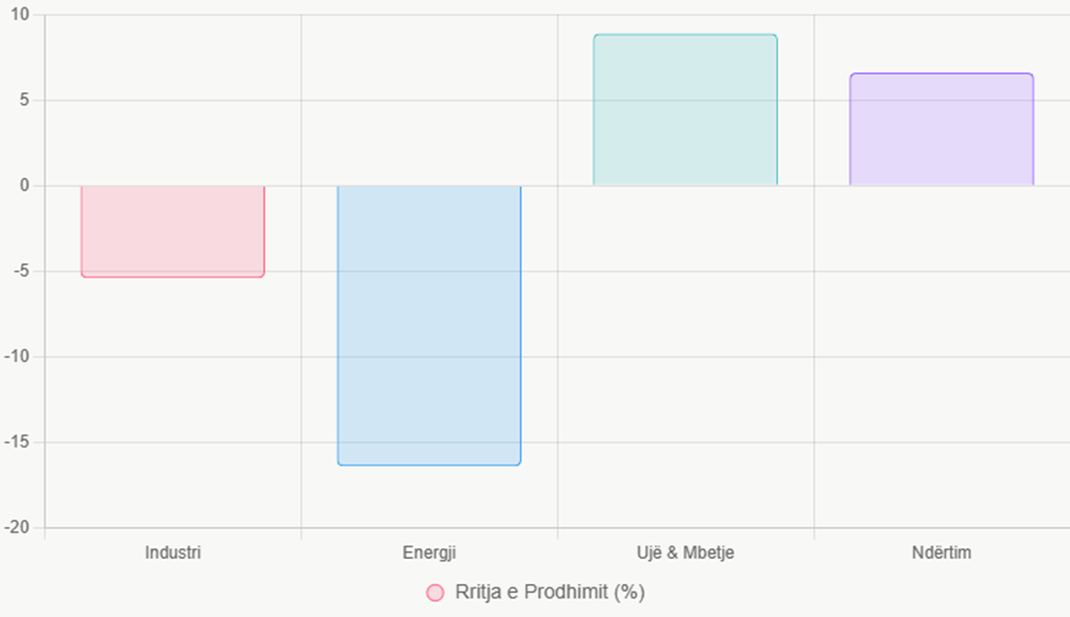 Në prodhim, energjia regjistron rënien më të madhe, duke sinjalizuar sfida në furnizim ose kërkesë. Kjo tendencë negative mund të ndikojë në eksporte, por rritja në ndërtim balancon pjesërisht humbjet.