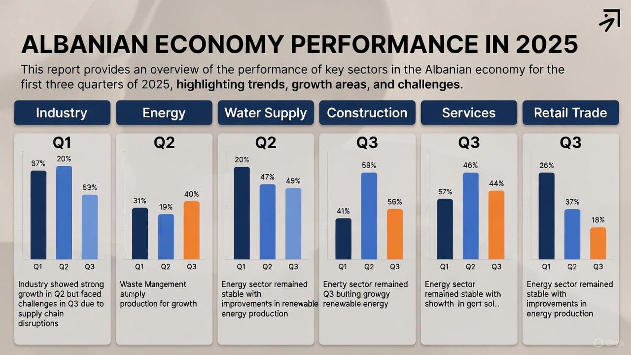 Bazuar në të dhënat zyrtare të INSTAT për Llogaritë Kombëtare Tremujore dhe treguesit strukturorë të ndërmarrjeve, si dhe parashikimet nga FMN dhe Banka e Shqipërisë, ekonomia shqiptare ka shfaqur një rritje të qëndrueshme gjatë vitit 2025, por me dallime të dukshme midis sektorëve.