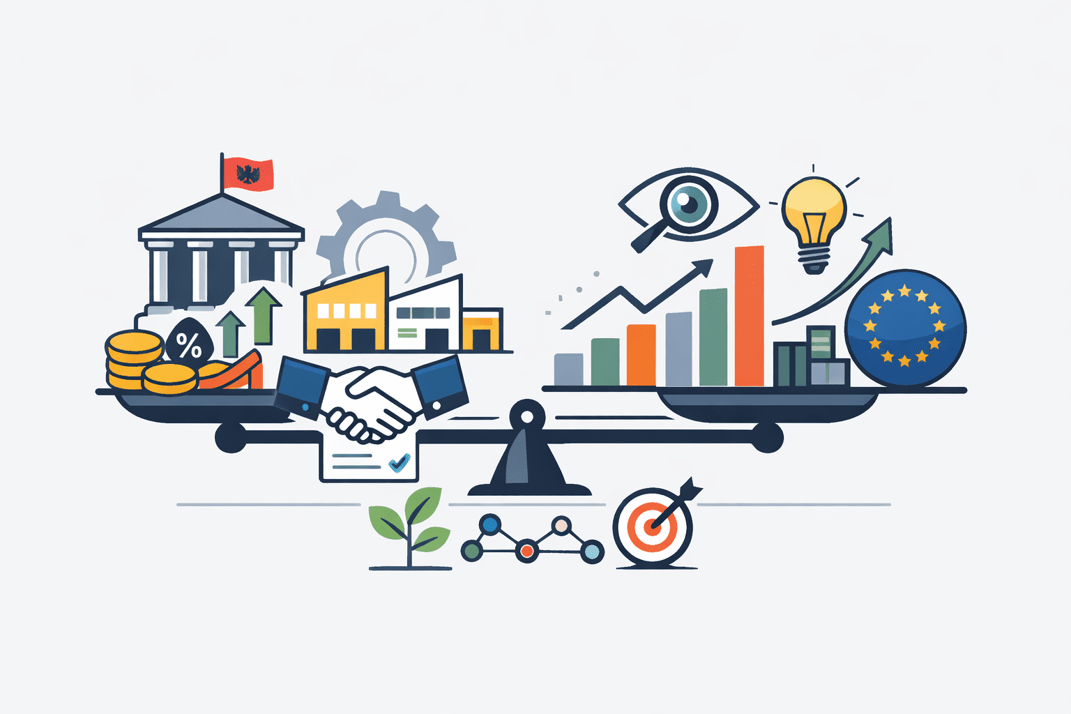 Në planin më të gjerë zhvillimor, Shqipëria vijon të vuajë nga mungesa e një arkitekture të plotë të politikave të rritjes, ku politika monetare, fiskale, industriale dhe ajo e inovacionit të funksionojnë në mënyrë të koordinuar. Në këtë boshllëk, Banka e Shqipërisë po mbart një rol që në shumë vende i takon institucioneve zhvillimore apo politikave fiskale të dizajnuara posaçërisht për transformim ekonomik. Ky transferim peshe është funksional në afat të shkurtër, por problematik në afat të gjatë.